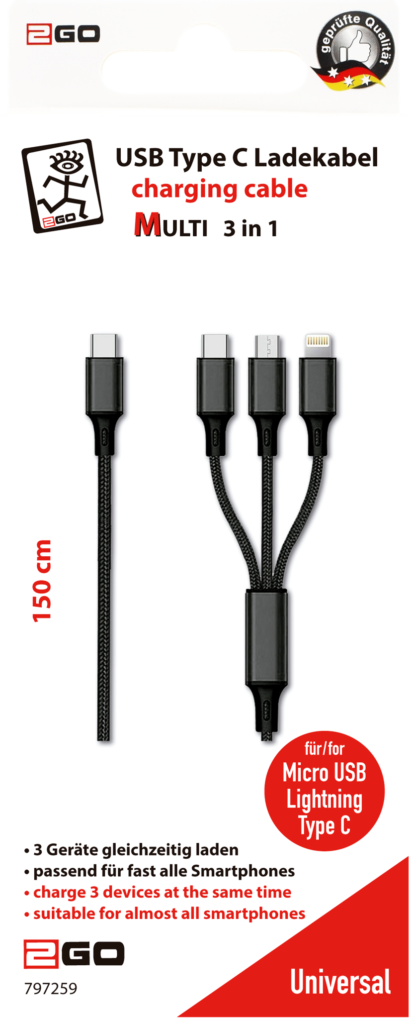 3 in 1 USB Ladekabel - schwarz - 150 cm