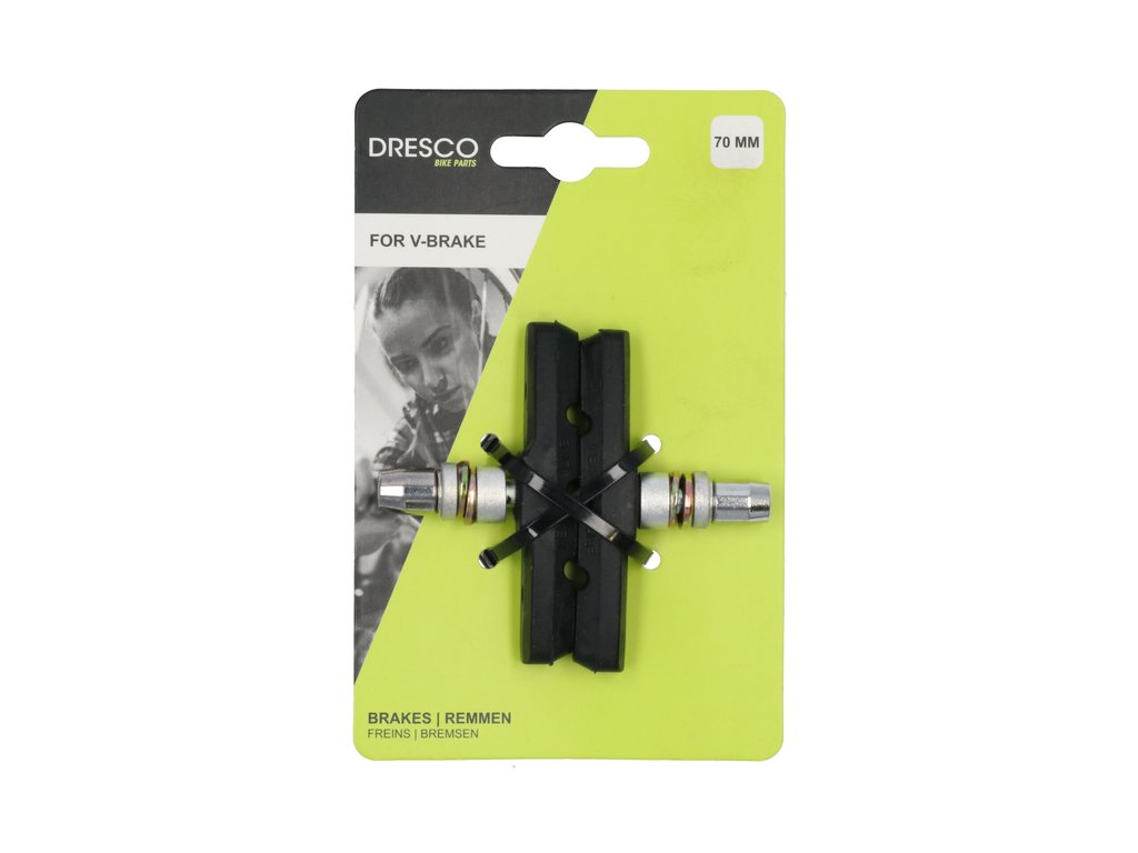 Diese Dresco Bremsschuhe sind für Fahrräder geeignet, die mit einer V-Brake Bremse ausgestattet sind, diese findet man oft an Mountainbikes oder sportlichen Fahrrädern. Die Bremsschuhe sind für die Vorder- oder Hinterradbremse geeignet und haben eine gute Bremsleistung bei trockenem und nassem Wetter. Schraube in der Mitte des Bremsschuhe. Die Bremsschuhe haben eine Länge von 70 mm und werden paarweise geliefert.