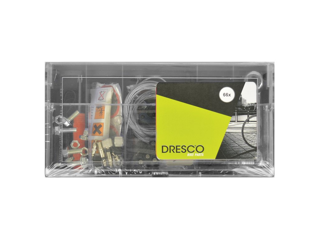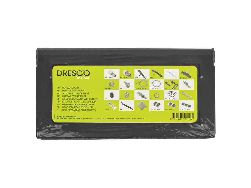Komplettes 66-teiliges Dresco Fahrrad-Reparaturset zur schnellen Reparatur Ihres Fahrrads. Dieses Set enthält: Fahrradbeleuchtung, Schutzblechschrauben und -muttern, Ventile, Reifenheber, Inbusschlüssel, Schraubenschlüssel, Schraubendreher, Beleuchtungskabel, Brems- und Schaltzüge, Bremsbeläge, Kettenglieder, Lösungsmittel und Reifenflicken in verschiedenen Größen. Alles verpackt in einer praktischen Lagerbox.