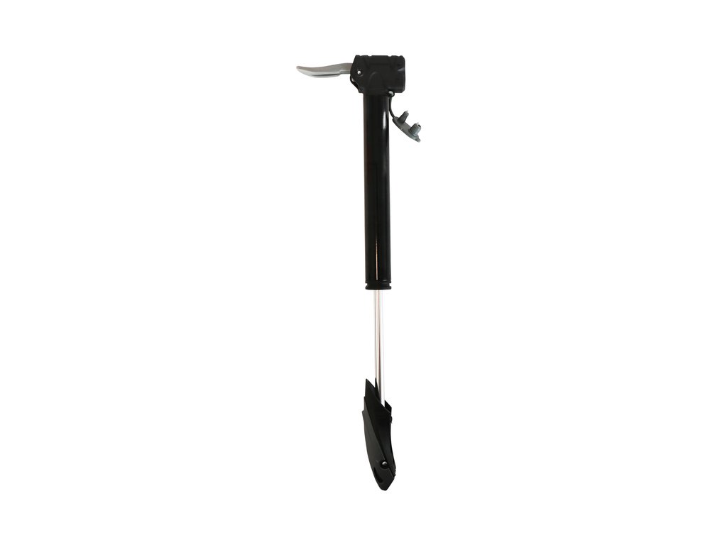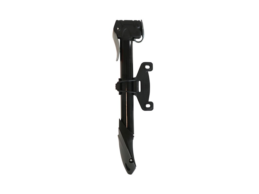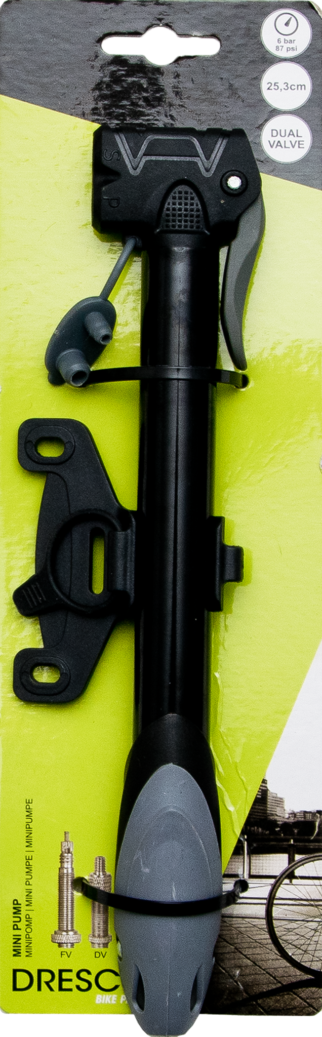 Aluminium Dresco Mini-Pumpe mit doppeltem Kunststoff-Pumpenkopf mit Staubkappe. Geeignet für alle Arten von Fahrradventilen (Schrader, Presta und Dunlop). Klappbarer Griff und Montagehalterung. Länge 250mm. Pumpenbereich bis zu 6 Bar/87 PSI.