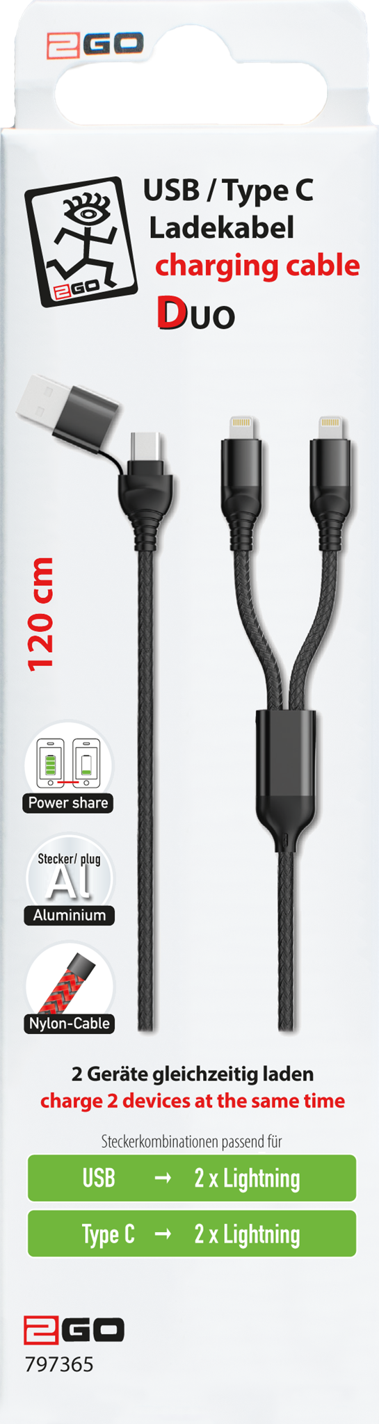 BeschreibungBewertungen Beschreibung Multi-LadekabelEingang: USB A oder USB Type-CAusgang: 2 x Lightning (Apple 8-Pin)Lädt bis zu 2 Geräte gleichzeitigUnterstützt OTG-Power-Sharehochwertige Aluminium-Steckermit NylonmantelLänge: 120 cm Bewertungen Geben Sie die erste Bewertung ab Es liegen keine Bewertungen vor