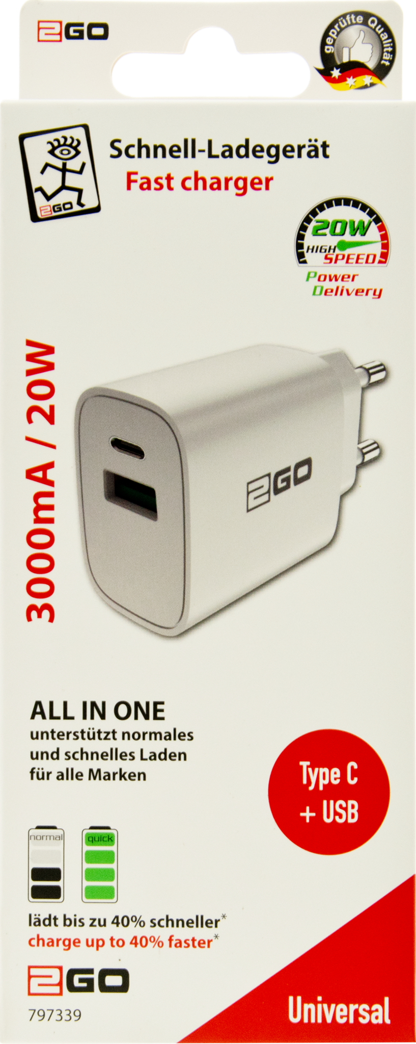 • Universal ALL-IN-ONE Schnell-Ladegerät mit USB A Buchse und USB Type-C Buchse.