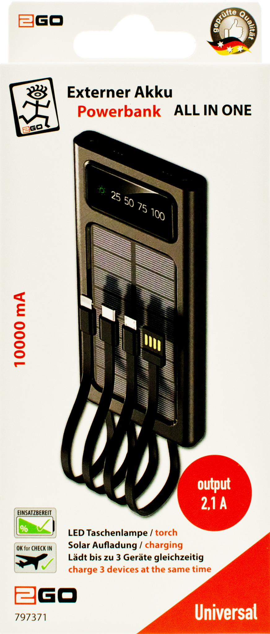 - Solarpanel zur Notfallversorgung (max. 300mAh)