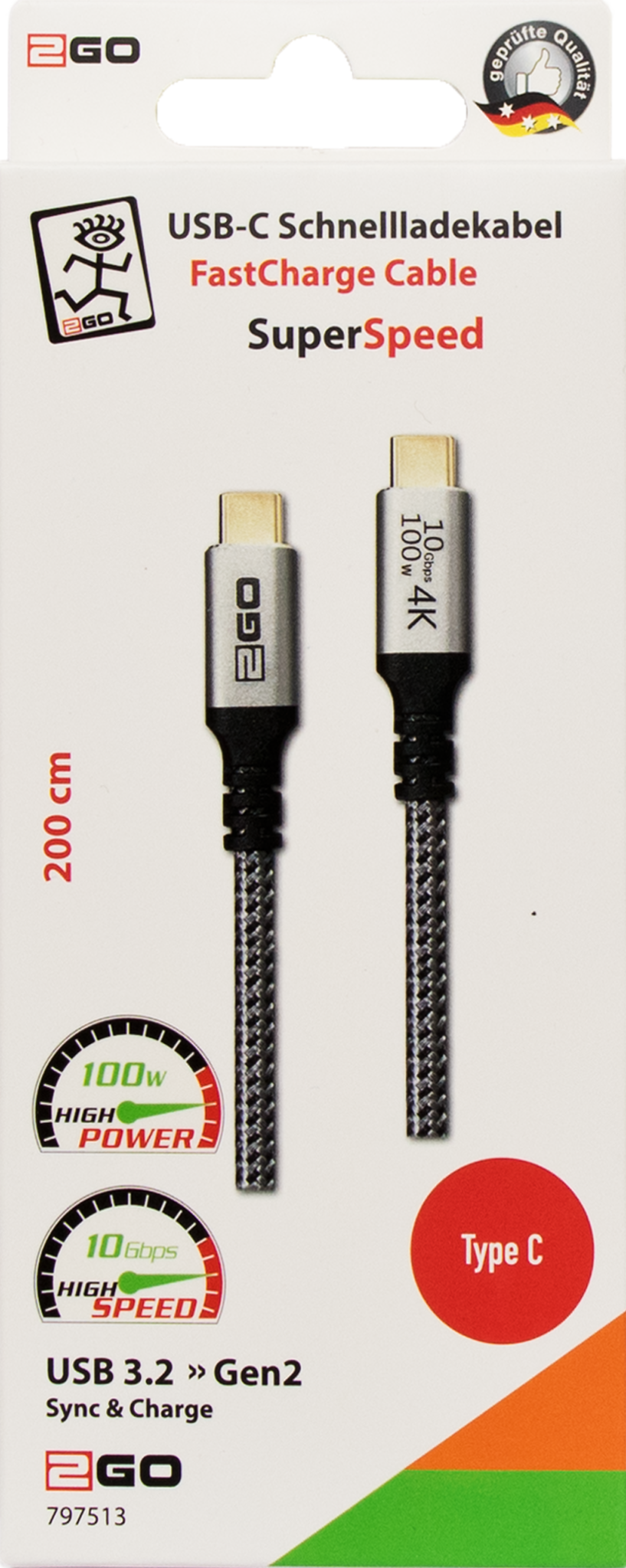 Das USB 3.2 Gen. 2 USB Type-C Ladekabel bietet eine Datenübertragungsgeschwindigkeit von bis zu 10 GBps. Es unterstützt Videoübertragung bis 4K (UHD) Auflösung.