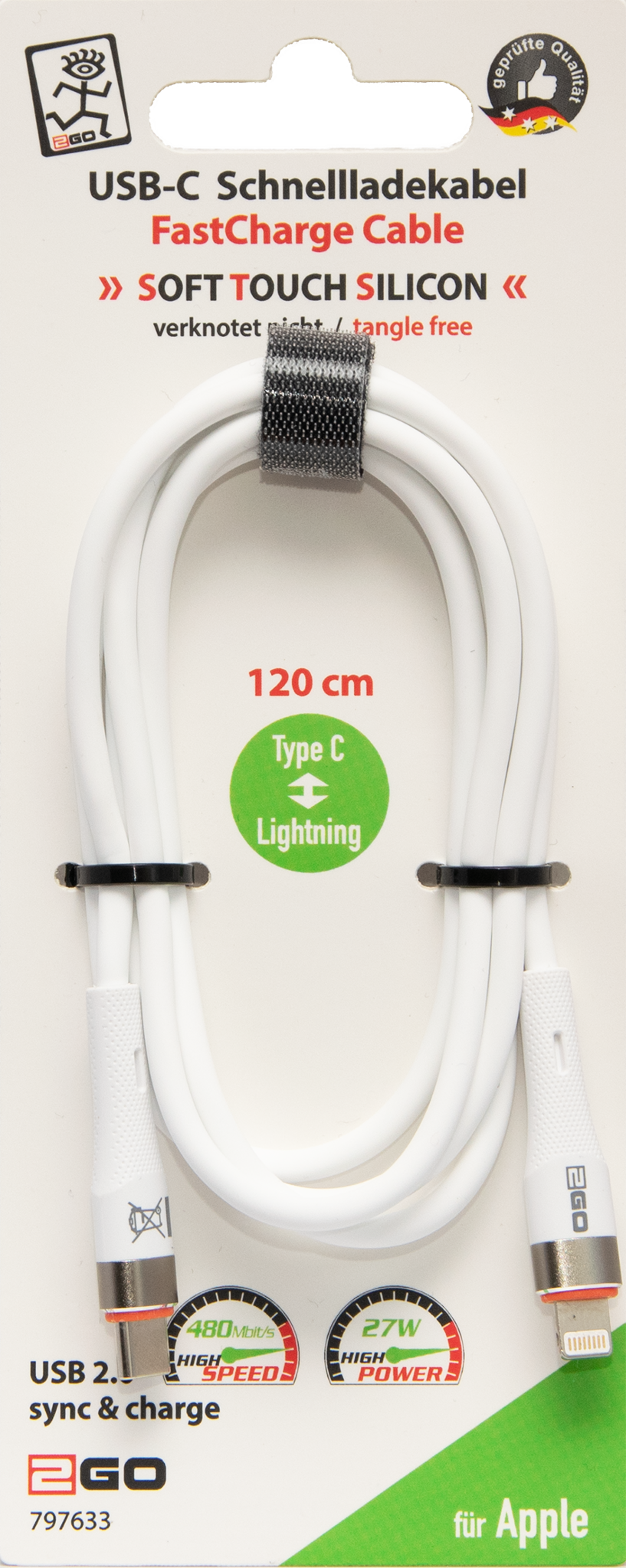 USB Datenkabel "Soft Touch Silicon" - 480 MBps - 27 W - weiß - 120 cm