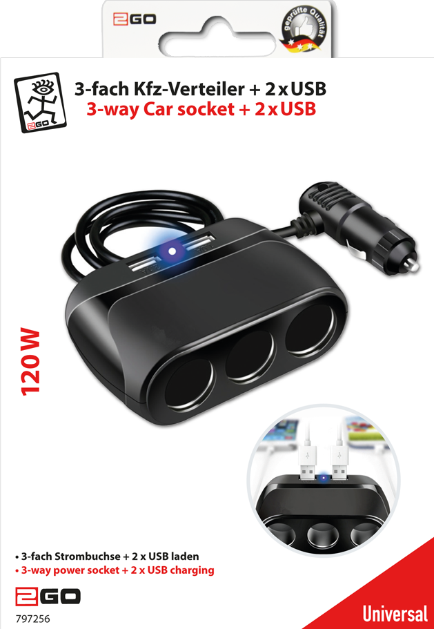 • Macht aus der Zigarettenanzünder Buchse in Ihrem Fahrzeug eine praktische Multisteckdose für bis zu 3 Geräte.